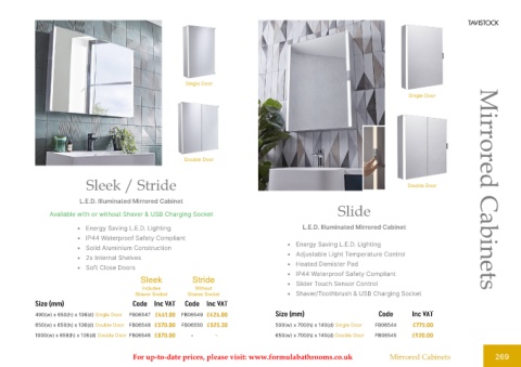 For up-to-date prices, please visit: www.formulabathrooms.co.uk Mirrored Cabinets 269