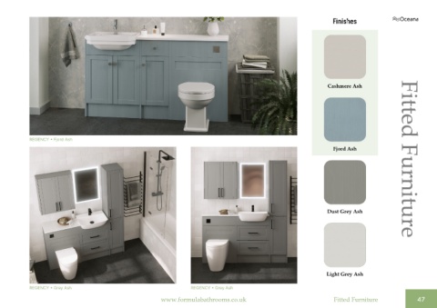 Finishes Cashmere Ash REGENCY • Fjord Ash Fjord Ash Fitted Furniture Dust Grey Ash Light Grey Ash REGENCY • Grey Ash REGENCY • Grey Ash www.formulabathrooms.co.uk Fitted Furniture 47
